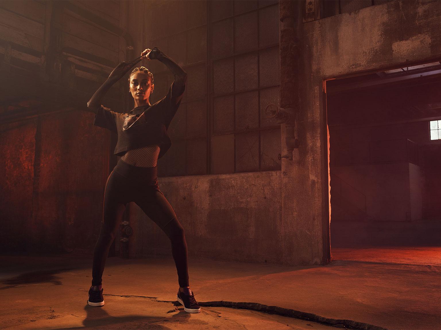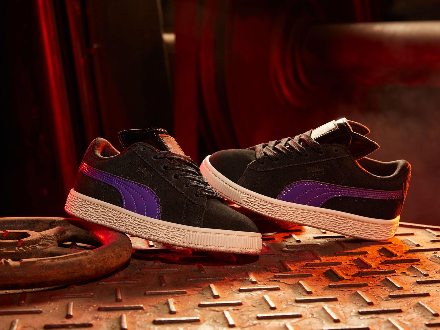 Footwear pieces, launching later this year, include a twist on the classic PUMA Suede, a Fierce 2 inspired by Selina Kyle (Catwoman), an all-over black RS-X silhouette with red accents, a sleek all-black Mayze with a pop of red in the formstrip, and two Court Rider hoops styles that pay homage to Batman and Catwoman.