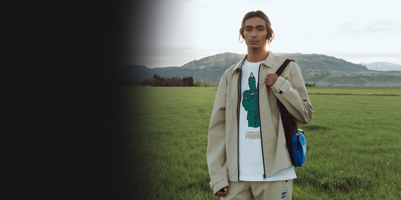 The PUMA X The Hundreds collection aims to increase awareness around our environmental impact and make us more conscious about the way we dress. Recycled and organic fabrics are used in the designs along with clever functionality. Many items are reversable, transformable, and multi-use. Sustainable materials used throughout the collection include recycled rubbers, organic cotton, chrome-free leathers, and recycled meshes for uppers, lining and sock liners. The looks are collegiate inspired with special graphics to highlight the sustainable aspect of the collection.