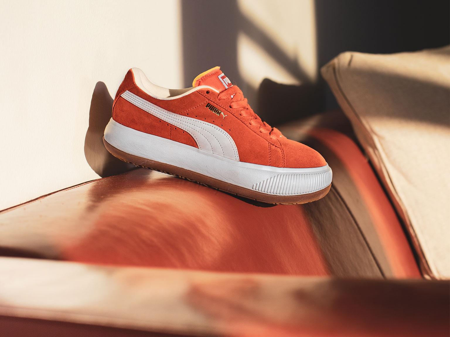 Dua Lipa is seen wearing the all-new Suede Mayu in a fashion-forward ensemble in her newest PUMA campaign, shot by legendary photographer Mario Sorrenti. PUMA’s new silhouette transforms the iconic Suede by playing with exaggerated proportions, a modern lens, and playful colors.