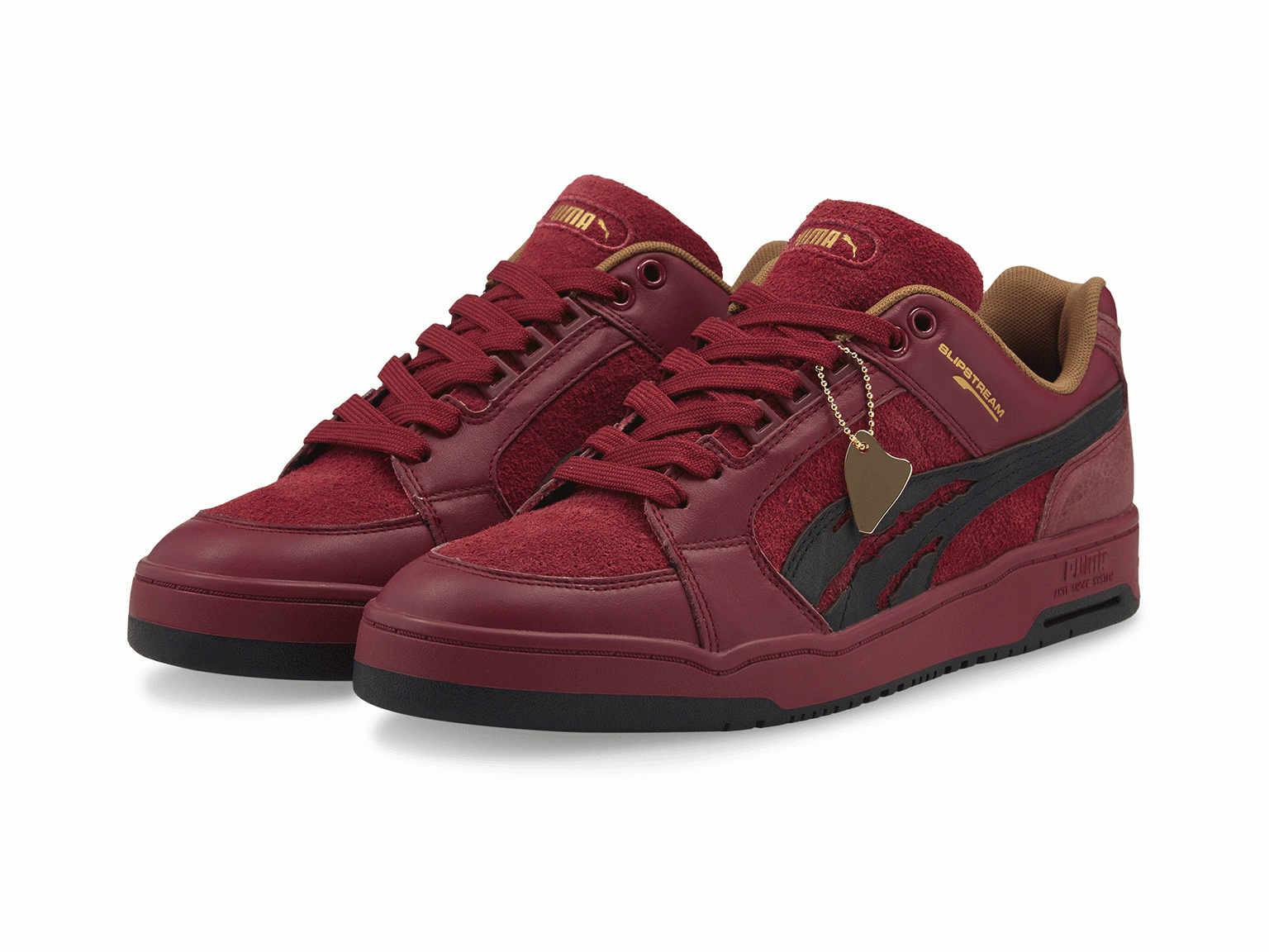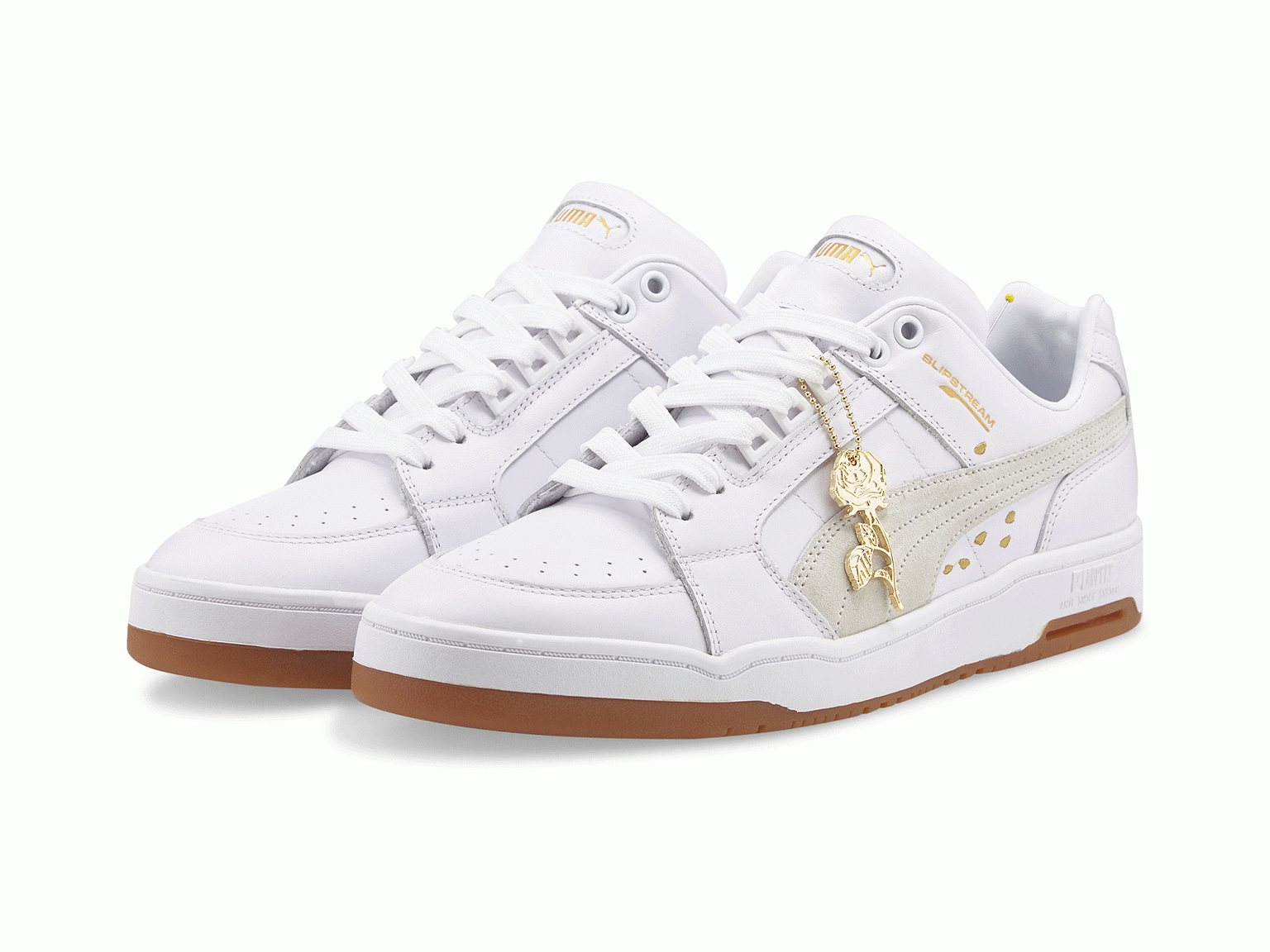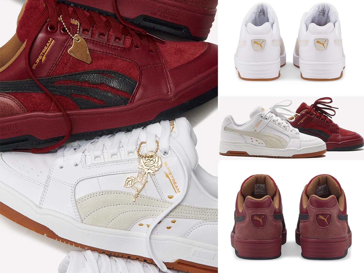 The Slipstream Lo Beast comes in burgundy with details such as a claw-pattern formstrip and a gold trinket. The Slipstream Lo Beauty comes in white leather with a rose trinket and petal embroidery on the quarter.