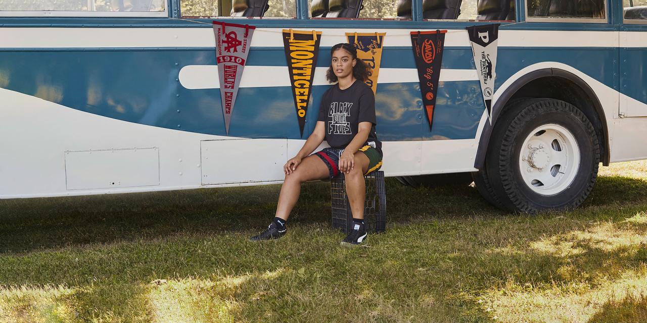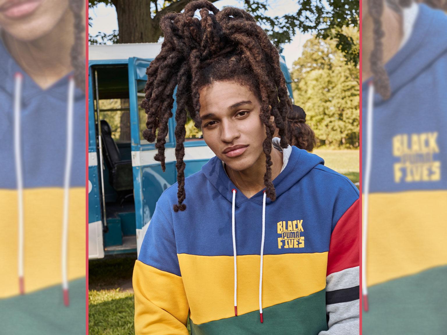 Items in the collection include multi-colored hoodie and sweatpants, shorts, T-shirt, long-sleeved T-shirt, cardigan, and a black Suede Mid Black Fives, which includes a pop of color on the sole and team logos on the formstrip.