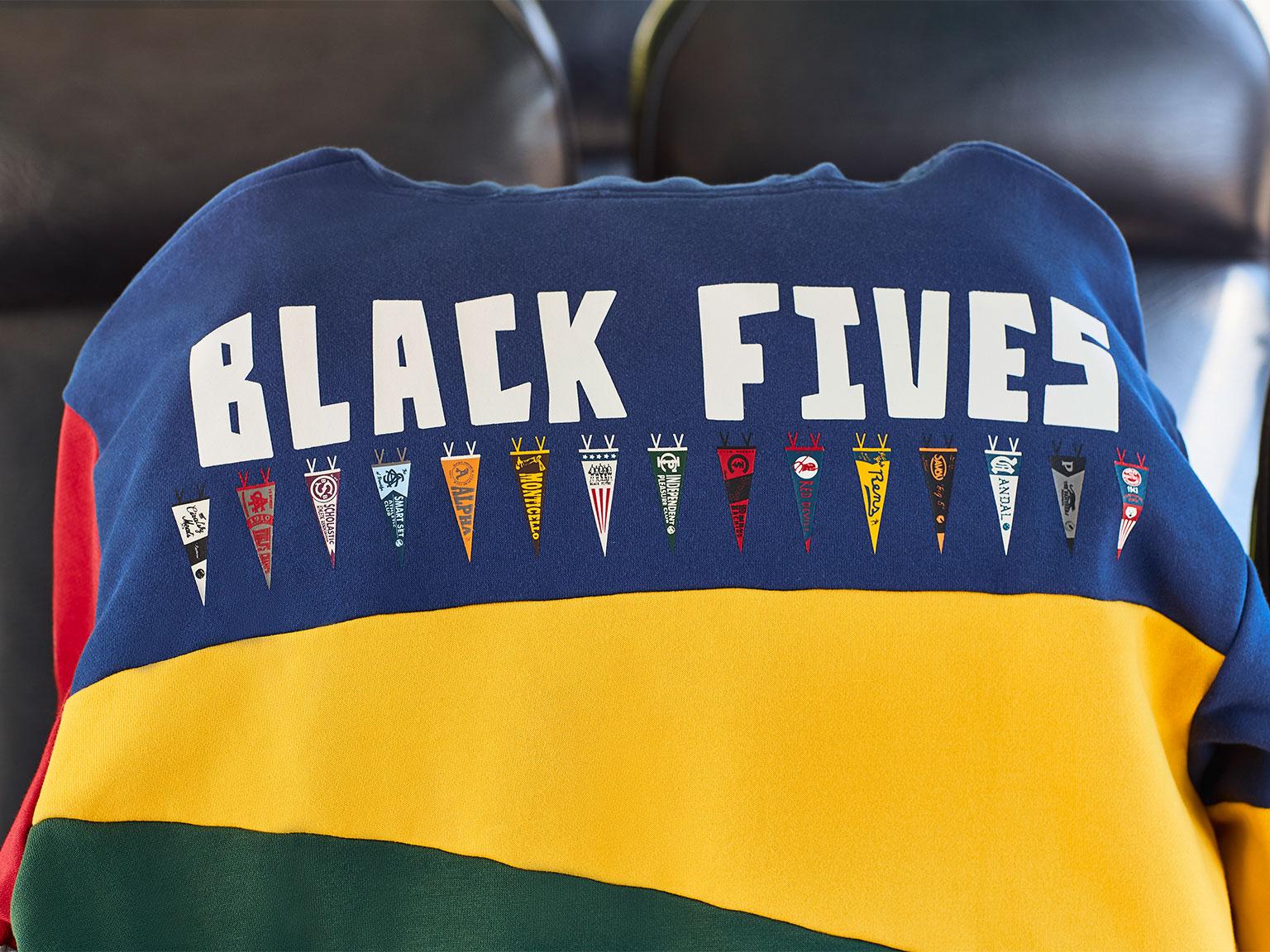 This seven-piece collection encompasses vintage-inspired designs with historical graphics and authentic logos maintained by the Foundation. Banner graphics showcase Black Fives teams along with cities they played in across the U.S. from Los Angeles to New York.